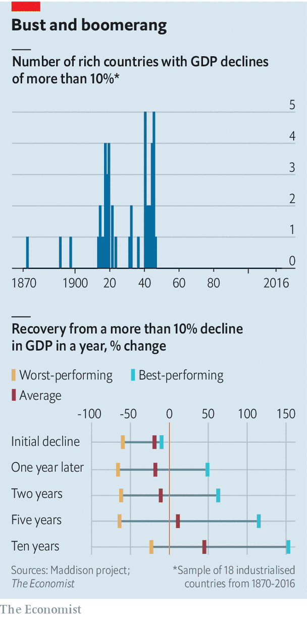 Second, large drops in output often accompany a fracturing of global trade networks. The success with which those trade ties are restored matters for the robustness of the economic rebound. Western Europe enjoyed explosive growth in the years after the second world war, thanks in part to efforts to knit trade back together—a very different outcome from that following the first. Similarly, the world must hope that trade recovers quickly when the pandemic ebbs.