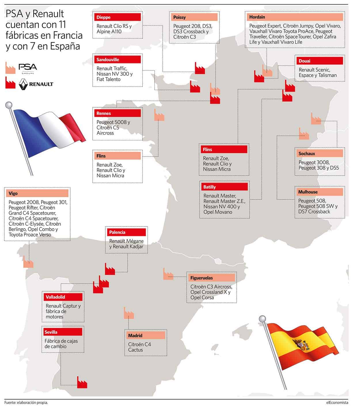 Nuestro país cuenta con 17 fábricas de automoción, de las que siete de ellas pertenecen a los dos grandes consorcios automovilísticos franceses: PSA, que engloba a las marcas Peugeot, Citroën, DS y Opel; y Renault, con la marca homónima, Dacia y Alpine. Así, mientras PSA tiene tres plantas en España (Vigo, Figueruelas y Madrid), la marca del rombo tiene hasta cuatro factorías ubicadas en nuestro país (dos en Valladolid, una en Palencia y otra en Sevilla).