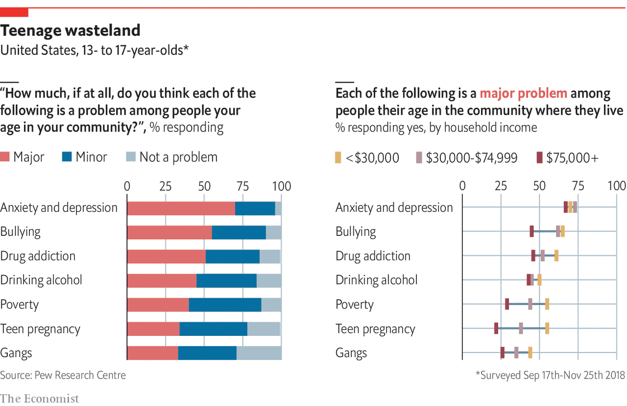 Most of the research so far about generation Z suggests that youngsters today are less hedonistic, better behaved and more lonely than ever before. A recent report by Pew Research Centre, a think-tank, reinforces that finding and sheds more light on this new cohort’s hopes and fears. In late 2018 Pew polled 920 Americans aged 13-17 about the problems that they have seen among their peers. The data show that they are far less concerned about age-old teenage problems like unplanned pregnancy and binge-drinking than they are about mental health. Fully 70% of respondents thought anxiety and depression were a major issue among their peers. Teenagers from poorer households tended to report a wider range of behavioural problems than those from rich households, but concerns about mental health seemed to affect both groups equally.